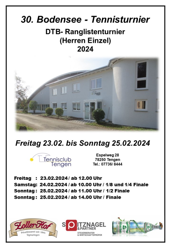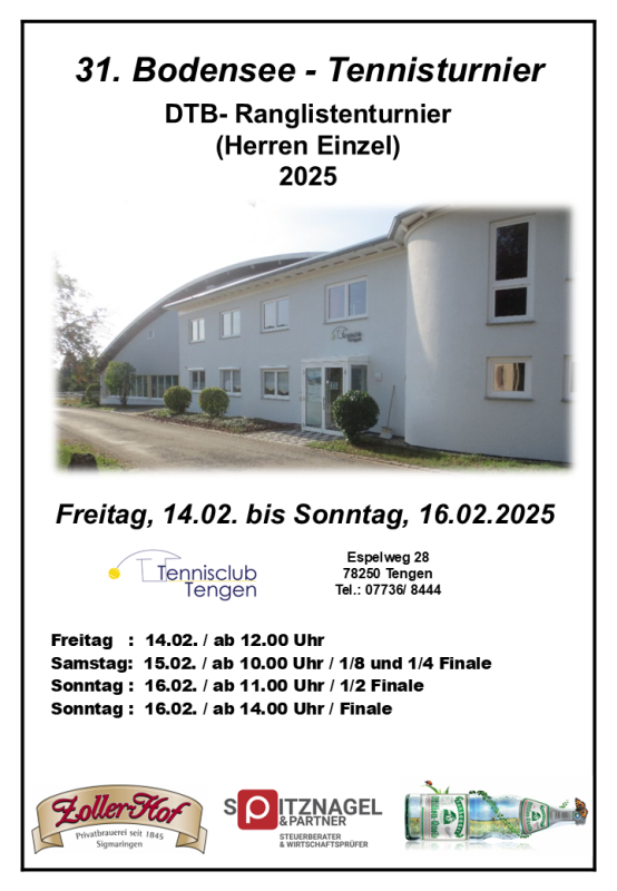 | | Wochenende | 25.01. bis 27.01.2013 | 19. Bodensee - Tennisturnier / Herreneinzel ( DTB - Ranglistenturnier ) | Herren | | |