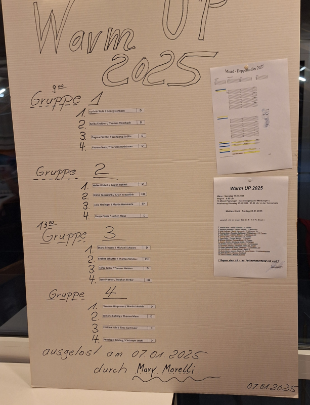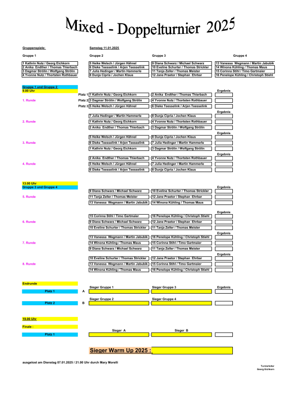 | | Samstag | 05.01.2013 | | Warm Up / Mixed - Doppelturnier | | Damen 2 | | |