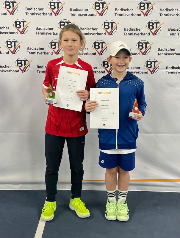 Carlo schaffte es mit einem Erstrundensieg unter die letzten acht, musste sich dann aber gegen den an Nr. 2 gesetzten Franz Schuler vom TC Nikolai Konstanz geschlagen geben. Joshua verlor zwar sein erstes Hauptrunden-Spiel, trumpfte dann aber in der Nebenrunde auf und ging dort als klarer Sieger im Finale gegen Tristan Schößler vom Platz. Herzlichen Glückwunsch! Weiter so!