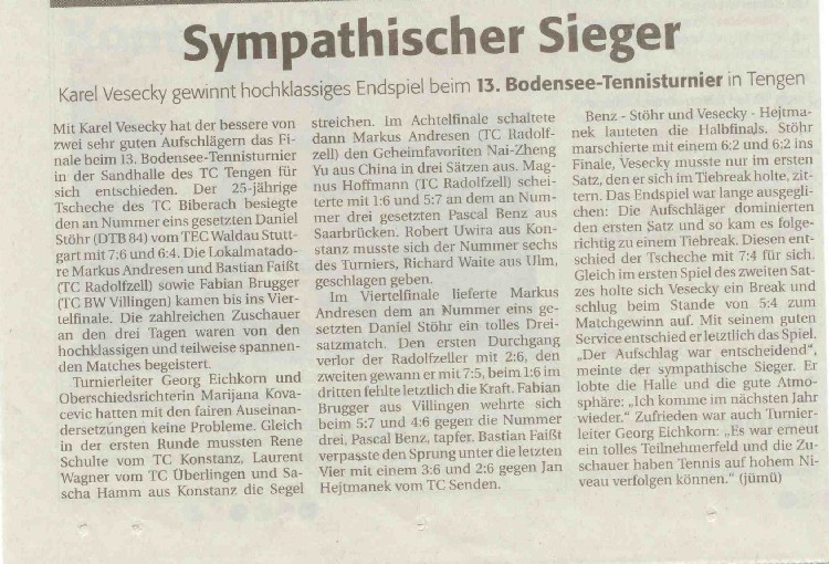 Die Nr. 12 des Bodensee Tennis Turnier (vormals Gölzer Cup in Markdorf) findet in der Zeit vom 10. bis 12. Februar 2006 in Tengen statt. Dieses hochkarätige Turnier das erstmals im Jahre 2005 in Tengen ausgetragen wurde, wird sicher auch in diesem Jahr mit packenden und spannenden Spielen aufwarten.