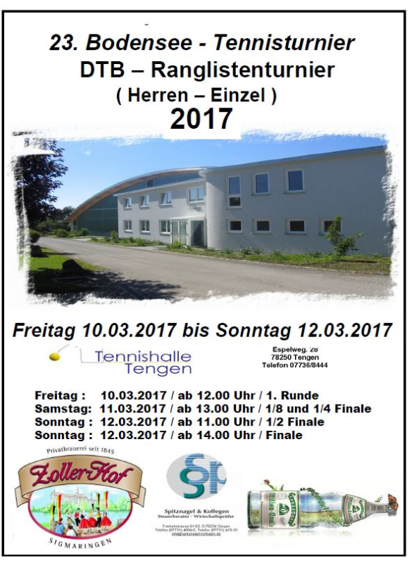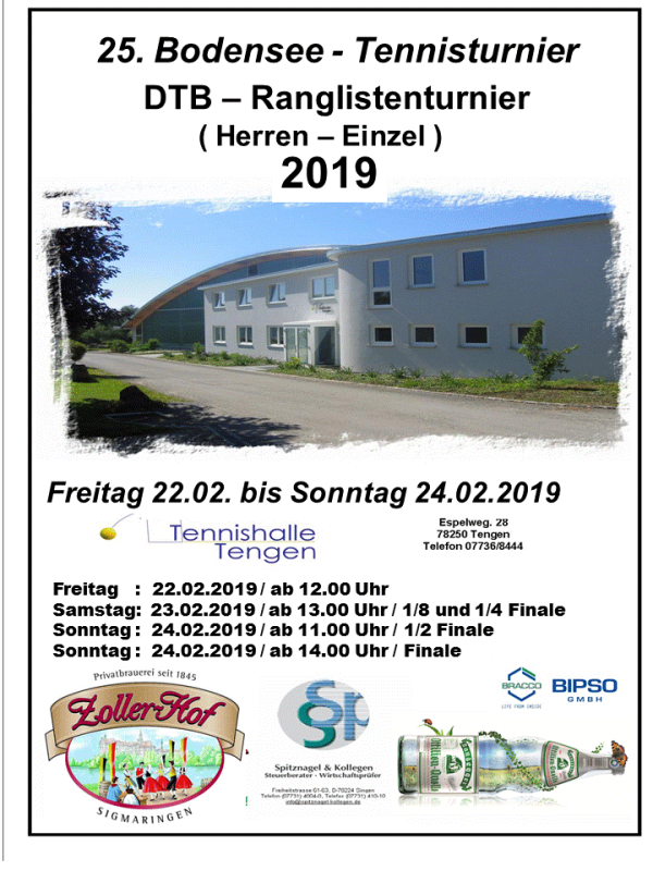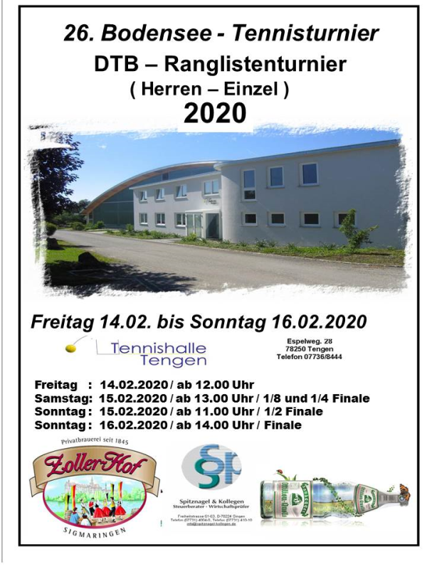 Die Bodensee-Tennisturniere finden am 11. bis 13. Februar 2005 ihre Fortsetzung in der Tennishalle in Tengen. Nach dem bisherigen Stand der Anmeldungen präsentiert der Tennisclub Tengen mit dem Hauptsponsor Brauerei Zoller-Hof und der ortsansässigen Metzgerei Kaiser ein illustres und hochkarätiges Starterfeld von 32 Herren.