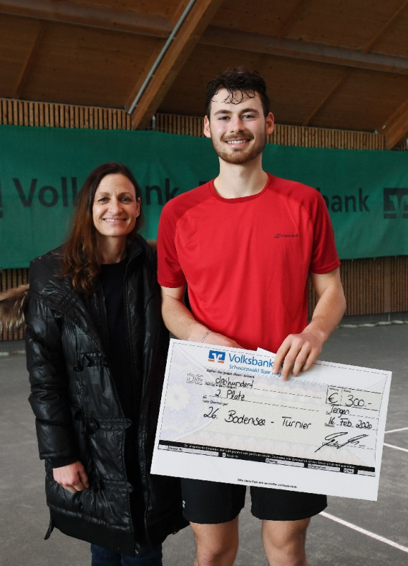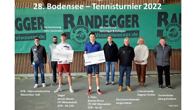 Im Finale des 28. Bodensee – Tennisturniers war Spannung pur angesagt. Der an Pos. 1 gesetzte Bastian Bross vom TC BW Oberweier ( TB – Nr. 87) verlor den 1. Satz knapp mit 6 : 4.  Im 2 Satz zog sich sein Gegner der an Pos.2 gesetzte Jannik Maute (DTB – Nr, 118) eine leichte Verletzung zu. Dennoch erspielte er sich auch diesen Satz mit 6 : 4 . Somit konnte sich Jannik Maute über den Turniersieg und den Siegerscheck in Höhe von 500 € freuen. Die beiden Finalisten hoben hervor, dass das Turnier sehr gut organisiert war.
