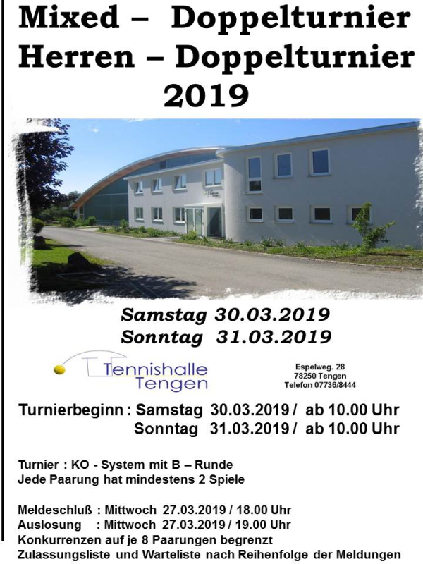 Am Sonntag, 18.11.2018, findet das erste Tennishallenevent in der Tengener Sandplatzhalle statt. Beim traditionellen Herren und Damendoppeltunier in den Altersklasse Damen 50 und Herren 50 wird dann um den ersten Tennishhallentitel gespielt.