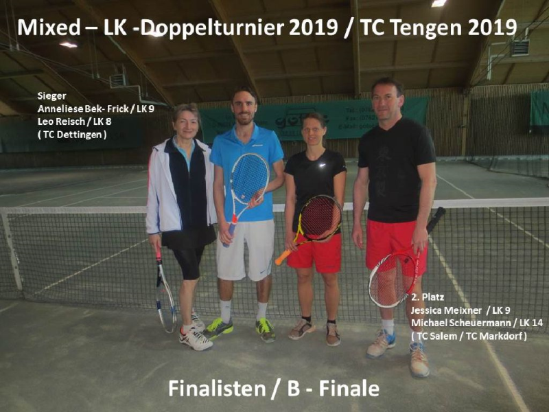 Das B – Finale wurde von Anneliese Bek-Frick / LK 9 / Leo Reisch / LK 8 ( TC Dettingen ) gegen Jessica Meixner / LK 9 / Michael Scheuermann / LK 14 ( TC Salem / TC Markdorf bestritten. In diesem setzte sich das Dettinger Doppel mit 6 : 2 und 6 : 2 durch.