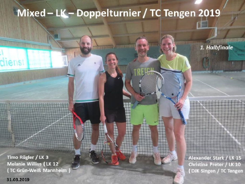 Für das 1.Halbfinale qualifizierten sich das an Pos. 1 gesetzte Doppel Melanie Willius / LK 13 / Timo Rügler / LK 3 vom TC Grün – Weiß Mannheim gegen Christina Preter / LK 10 / Alexander Stark / LK15 vom TC Tengen / DJK Singen. In diesem siegte das Mannheimer Doppel mit 6 : 3 und 7 : 6