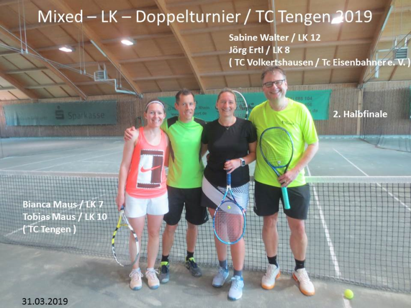 Im 2. Halbfinale spielten Sabine Walter / LK12 / Jörg Ertl / LK 8 vom TC Volkertshausen / TC Eisenbahner Sportverein e.V. gegen Bianca Maus / LK 7 / Tobias Maus / LK 10 vom TC Tengen um den Einzug ins Finale.Mit 6 : 1 un d 6 : 1 siegten Bianca und Tobias Maus klar und zogen somit ins Finale ein.