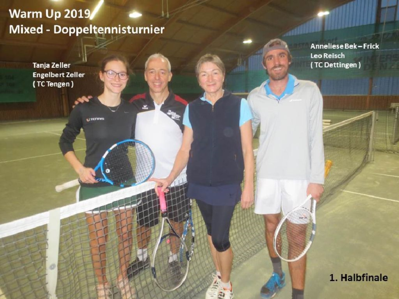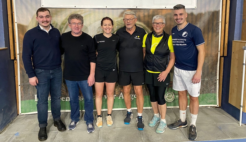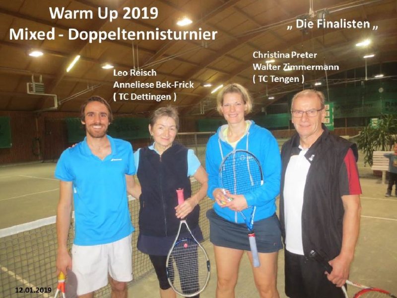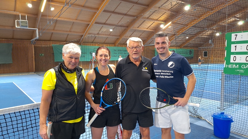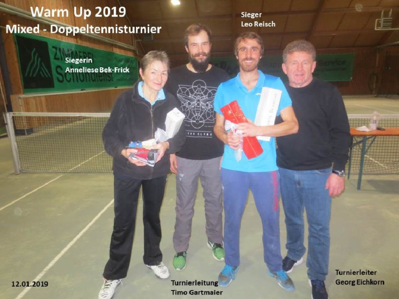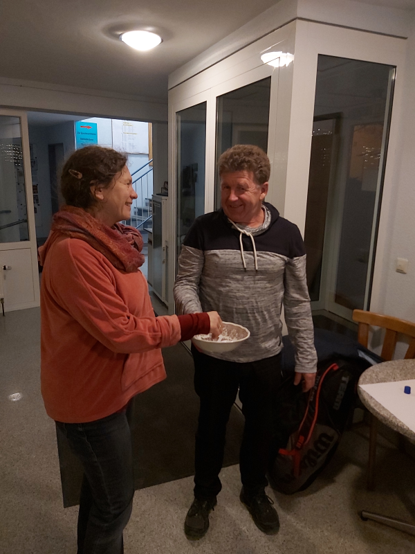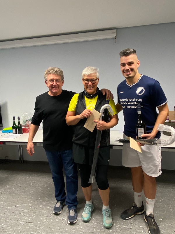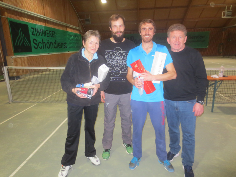 Mit dem 1. Hallenturnier im Neuen Jahr landete der Tennisclub einen Volltreffer in sportlicher wie in gesellschaftlicher Sichtweise. 66 Jahre musste jedes Team gemeinsam alt sein und so meldeten sich 12 Paare an. Sportwart Eichkorn (Herren 40) und Margrit Gruler (Damen 40) erhielten den „Ältestenpreis“, schieden aber im Halbfinale gegen Walter Zimmermann (Herren 40) und Tochter Melanie (Damen 1) aus. Deutlich behielten auch die Favoriten Kuno Eisenmann (Herren 50) und Vereinstrainerin Marijana gegen die bestplatzierten Gruppenzweiten Jonny Keller (Herren 40) mit Schwester Heidi (Damen 40) die Oberhand und siegten dann auch im Finale gegen Zimmermann/Zimmermann – sie erhielten den „Jüngstenpreis“.