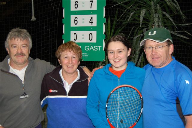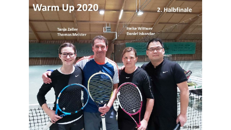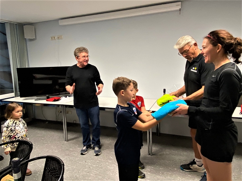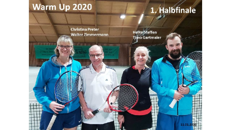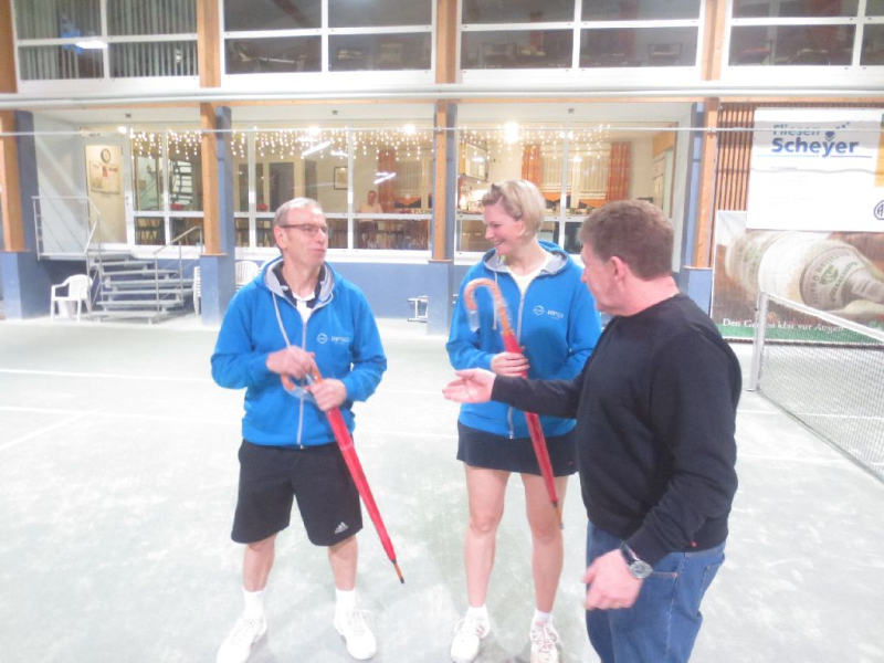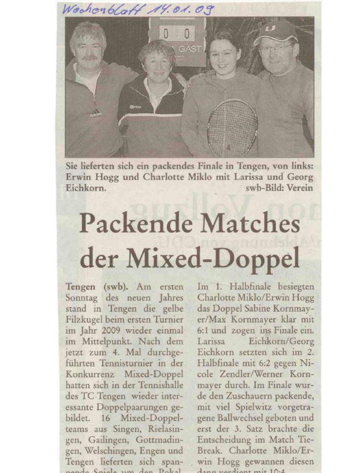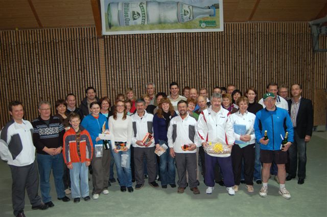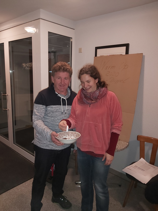 Mit dem 1. Hallenturnier im Neuen Jahr landete der Tennisclub einen Volltreffer in sportlicher wie in gesellschaftlicher Sichtweise. 66 Jahre musste jedes Team gemeinsam alt sein und so meldeten sich 12 Paare an. Sportwart Eichkorn (Herren 40) und Margrit Gruler (Damen 40) erhielten den „Ältestenpreis“, schieden aber im Halbfinale gegen Walter Zimmermann (Herren 40) und Tochter Melanie (Damen 1) aus. Deutlich behielten auch die Favoriten Kuno Eisenmann (Herren 50) und Vereinstrainerin Marijana gegen die bestplatzierten Gruppenzweiten Jonny Keller (Herren 40) mit Schwester Heidi (Damen 40) die Oberhand und siegten dann auch im Finale gegen Zimmermann/Zimmermann – sie erhielten den „Jüngstenpreis“.