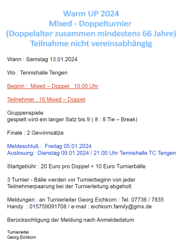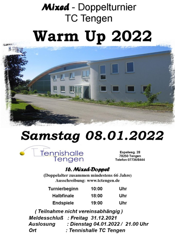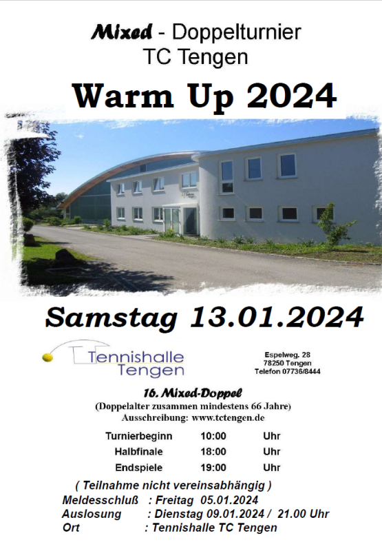 Am Samstag 13.01.2024 startet der TC Tengen mit seinem traditionellen Warm Up - Tennisturnier in die neue Tennissaison 2024.